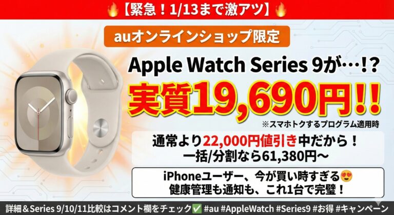 auオンラインショップで、Apple Watch Series 9 41mmが期間限定で22,000円割引になる激アツキャンペーンが開催中です。しかもこの割引、1/13までのオンラインショップ限定。 条件を満たせば👉 実質負担19,690円(41mm)👉 一括・分割でも 61,380円(41mm)〜 「Apple Watchを買うなら、正直いまが一番お得なタイミング」と言っても過言ではありません。 […]