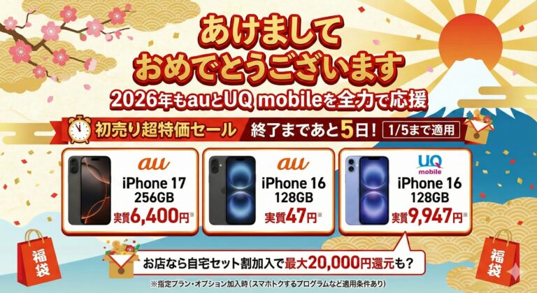あけましておめでとうございます🎍 2026年も au・UQ mobileのおトク情報を全力で発信していきますので、今年もどうぞよろしくお願いします! さて、新年早々ですが――これは見逃し厳禁。 auの「初売り超特価セール」が現在開催中で、**終了まであと5日(1/5まで適用)**となっています。 今回は特に注目すべき iPhoneの破格案件を分かりやすくまとめました👇 🔥 au […]