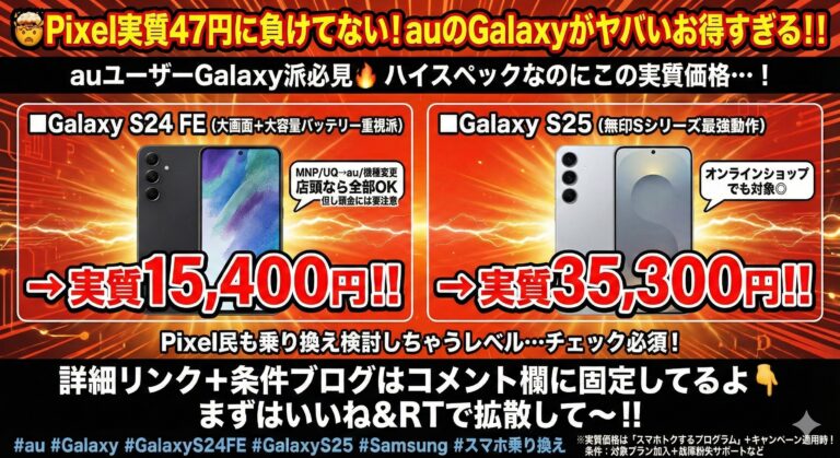 「Pixelが実質47円で話題だけど、Galaxy派には選択肢がない…」 そんなことはありません🔥現在、auのGalaxyキャンペーンが想像以上に強烈です。 条件を満たせば ハイスペックGalaxyが“Pixel級の実質価格”で狙えます。 📱 今回の目玉機種はこちら ■ Galaxy S24 FE 大画面&バッテリー重視の高コスパモデル 👉 条件達成で 実質15,400円 ■ Galax […]