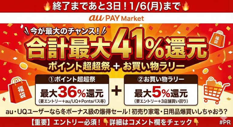 実際に一番おトクになる買い方を分かりやすく解説! 【広告・PRについて】 当サイトはアフィリエイト広告を利用しています。記事内のリンクから商品・サービスを申し込むことで、運営者に報酬が発生する場合があります。 au PAYマーケットでは不定期で「最大41%還元」 といった非常に強力なキャンペーンが開催されます。 ただし――仕組みを正しく理解しないと、数字だけ見て損をする可能性も。 この記事では、 […]