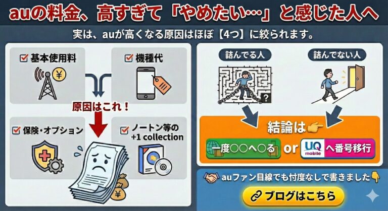 「au 高い」「au やめたい」そう検索してこのページにたどり着いたあなたは、今のスマホ料金に強い不満を感じているのではないでしょうか。 本記事では、「auの料金が高くなる本当の理由」と「今すぐ取れる現実的な解決策」を、auファンの立場でも忖度なしで解説します。 ※・電波が悪いからやめたい・店舗対応が悪いからやめたい という方は、正直このブログでは解決できません。今回は**「料金が高い」という悩み […]