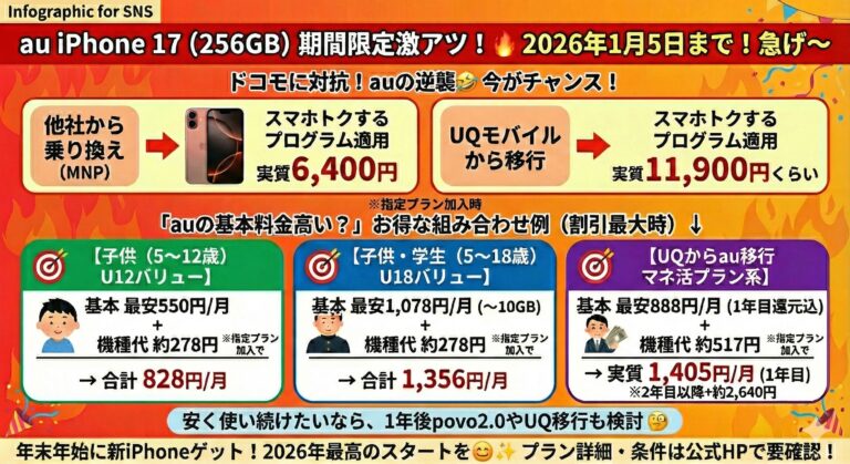 【2026年1月5日まで】 auのiPhone 17が実質6,400円!子ども・学生・UQユーザー別「最安プラン完全ガイド」 「auって基本料金が高いんでしょ?」そう思っている方にこそ知ってほしい、今だけの“異常に安い”iPhone 17キャンペーンが始まっています🔥 条件を満たせば、 さらに使い方次第では、月1,000円前後でiPhone 17を運用することも可能です。 この記事では、①子ども向 […]